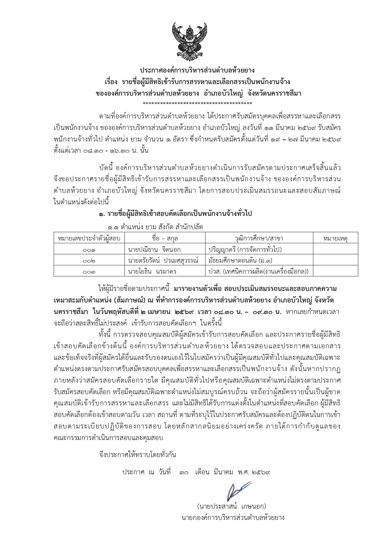 ประกาศ รายชื่อผู้มีสิทธิเข้ารับการสรรหาและเลือกสรรเป็นพนักงานจ้างทั่วไป